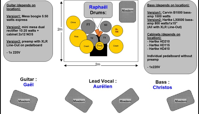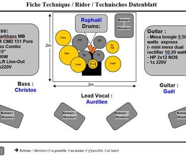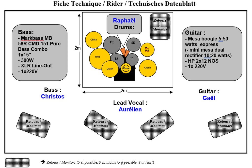 Below you'll find our technical data sheet. We can also provide our own sound system and lighting for indoor events (restaurants, bars, private parties).